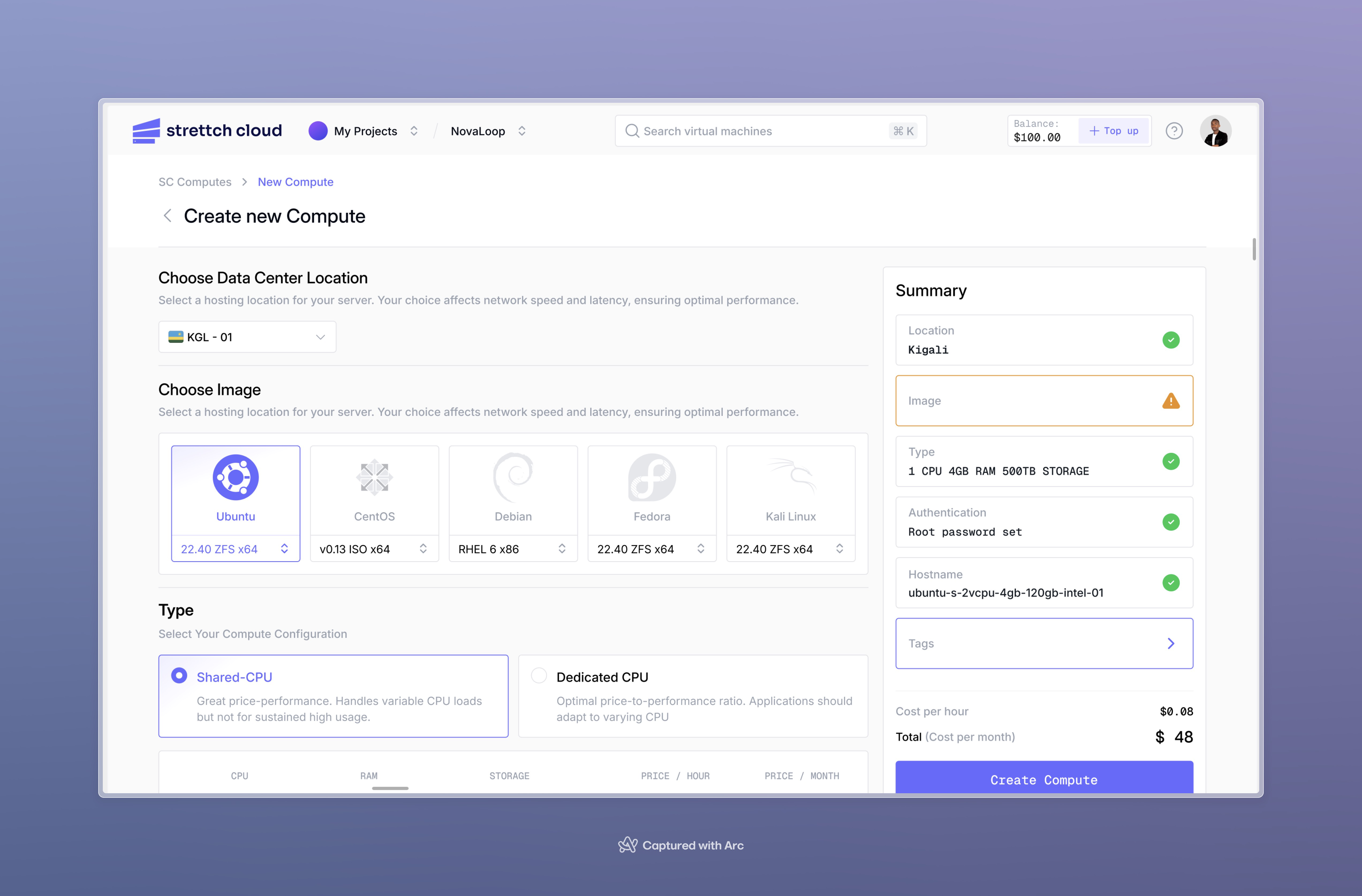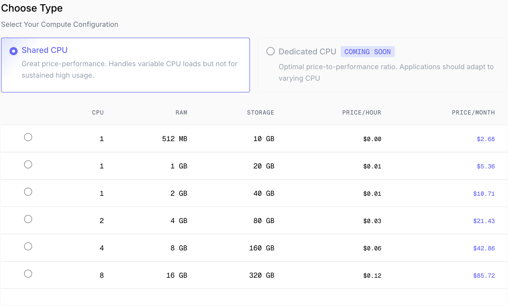 Shared CPU: Cost-effective for applications with variable load patternsDedicated CPU: Consistent performance for production workloadsAfter choosing the type, specify your compute specs: CPU, RAM, Storage. Pricing is displayed alongside each configuration so you can see costs in real-time.