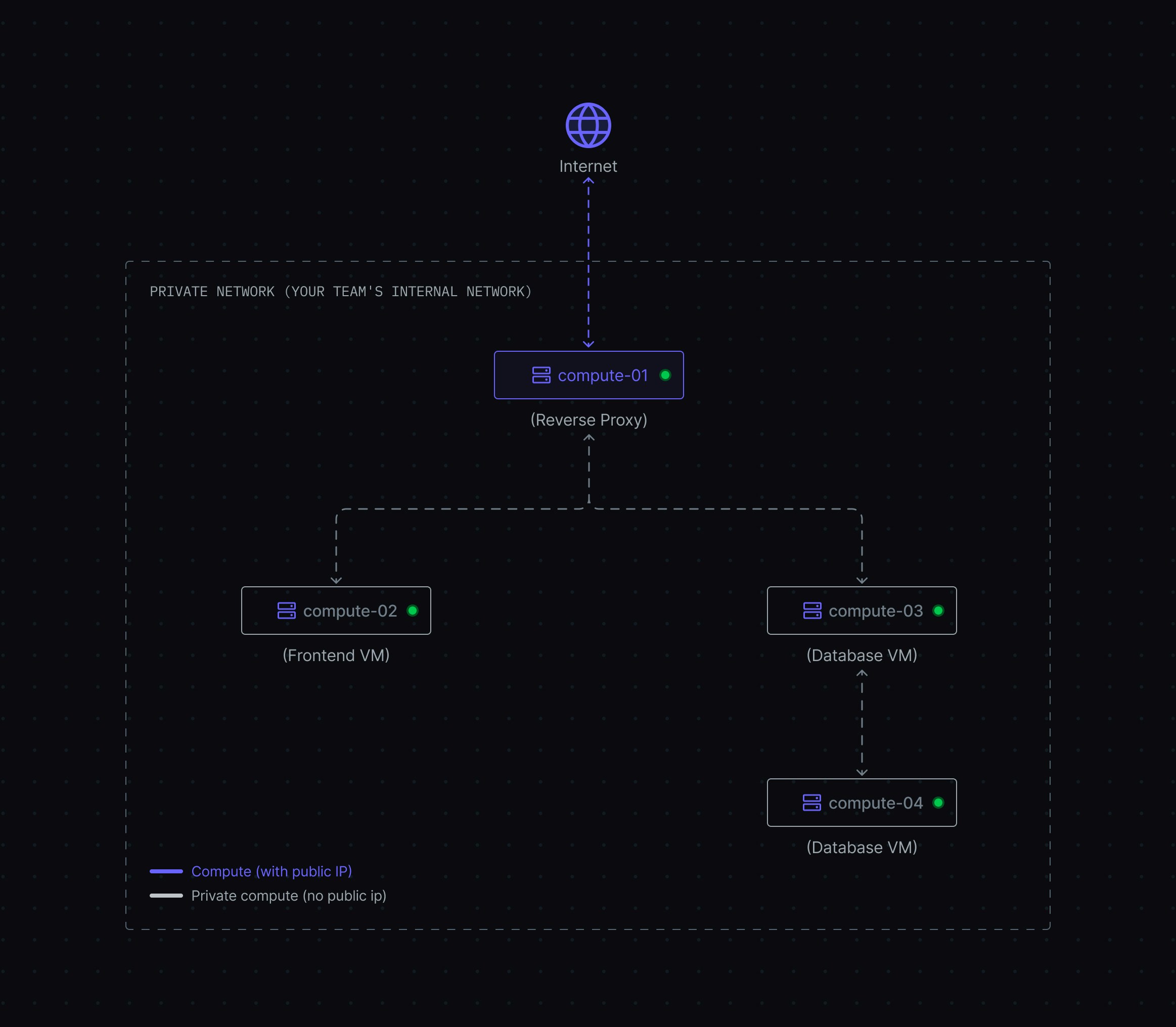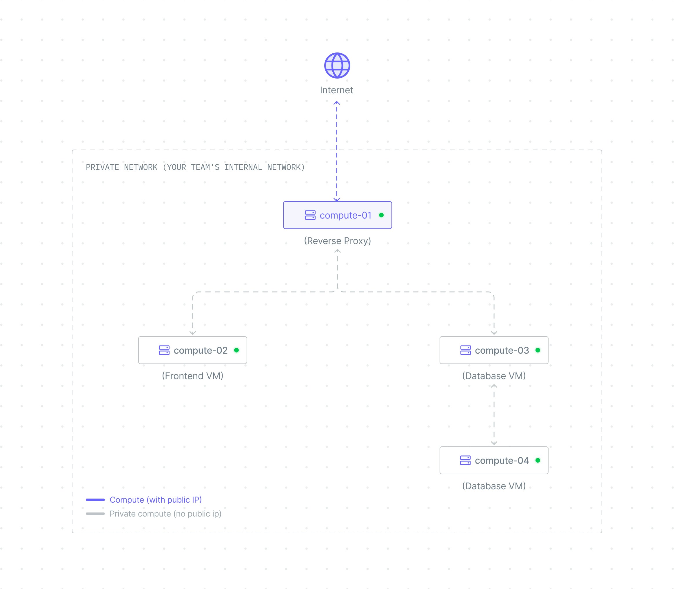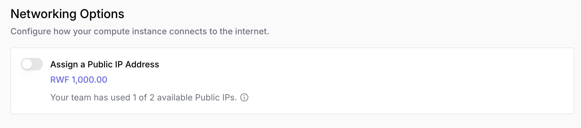 By default, compute instances are not assigned a public IP address. They remain in a private network, inaccessible from the internet but able to communicate with other instances in your team.When You Need a Public IP